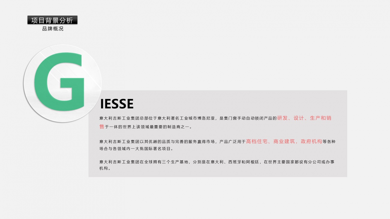 項目背景:意大利吉斯工業集團總部位于意大利著名工業城市博洛尼亞,是集門窗手動自動鎖閉產品的研發、設計、生產和銷售于一體的世界上該領域最重要的制造商之一。